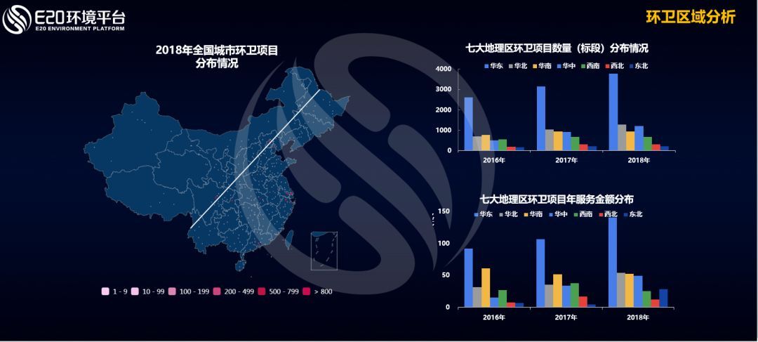 E20研究院數(shù)據(jù)中心詳細(xì)分析了七大區(qū)域中環(huán)衛(wèi)市場化項(xiàng)目占比,可以看出華東、華南這兩個(gè)區(qū)域占比最高。