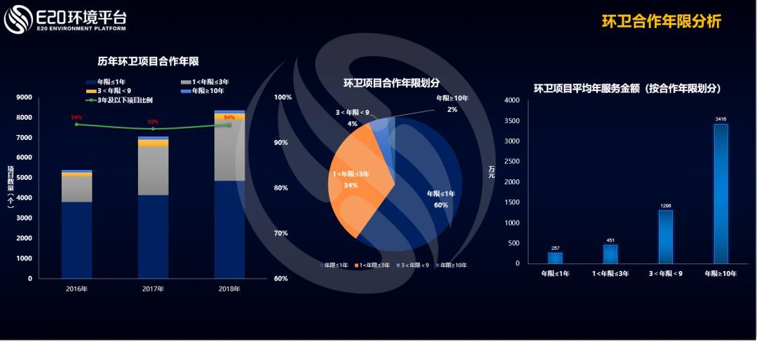 從標(biāo)段情況分析,合作年限在1~3年的項(xiàng)目分標(biāo)段的比例最高,從行政區(qū)劃來看,環(huán)衛(wèi)項(xiàng)目在城市中分標(biāo)段的比例較高。從服務(wù)內(nèi)容來看,前端的業(yè)務(wù),也就是清掃保潔的業(yè)務(wù)占82%,中端業(yè)務(wù)11%,中端加后端0.24%。