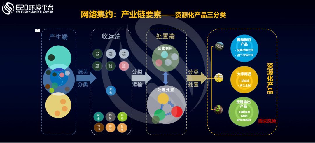 上圖對(duì)城市各種固廢的網(wǎng)絡(luò)集約進(jìn)行了總結(jié),其中廢物實(shí)現(xiàn)資源化的模式我們進(jìn)行了分類,可分為網(wǎng)絡(luò)剛性產(chǎn)品、大宗產(chǎn)品以及定制輸出產(chǎn)品。網(wǎng)絡(luò)剛性產(chǎn)品包括焚燒發(fā)電并網(wǎng),沼氣包銷并網(wǎng);大宗產(chǎn)品包括基礎(chǔ)油,再生金屬等;定制輸出產(chǎn)品包括土壤修復(fù)劑,有機(jī)肥,建筑垃圾輔料等。其中,對(duì)于網(wǎng)絡(luò)剛性產(chǎn)品和大宗產(chǎn)品,都不太用考慮后端消納的痛點(diǎn)(即不需要面對(duì)資源化產(chǎn)品銷售的需求風(fēng)險(xiǎn)),然而定制輸出類產(chǎn)品則在這個(gè)方面成為痛點(diǎn),也是屬于網(wǎng)絡(luò)集約所提供的可持續(xù)開發(fā)和差異化競爭的市場機(jī)會(huì)。