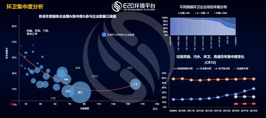 上圖顯示,環(huán)衛(wèi)集中度呈現(xiàn)一個(gè)反拋物線的狀態(tài)。在每個(gè)省來看,當(dāng)環(huán)衛(wèi)市場化項(xiàng)目剛剛出現(xiàn)的時(shí)候,大概只有一兩家、兩三家企業(yè)去參與,或者少數(shù)企業(yè)來參與。市場發(fā)展到一定程度,例如圖中浙江省,開始出現(xiàn)大量項(xiàng)目的時(shí)候,集中度會(huì)下降,比如浙江有1372家環(huán)衛(wèi)企業(yè)。而隨著市場化的推進(jìn),市場規(guī)模進(jìn)一步擴(kuò)大之后,寡頭壟斷開始逐步出現(xiàn),行業(yè)集中度出現(xiàn)上揚(yáng),大企業(yè)龍頭效應(yīng)出現(xiàn)。比如廣東作為市場規(guī)模最大的省份,其參與主體開始減少,集中度會(huì)上揚(yáng)。對(duì)不同年限項(xiàng)目的歸屬進(jìn)行分析來看,環(huán)衛(wèi)行業(yè)雖然小企業(yè)很多,但是10年以上大體量大項(xiàng)目大都被大型企業(yè)握在手中。(相關(guān)鏈接→ 啟迪桑德年報(bào)看點(diǎn):環(huán)衛(wèi)業(yè)務(wù)漲125%,圍繞環(huán)衛(wèi)及物流買買買)