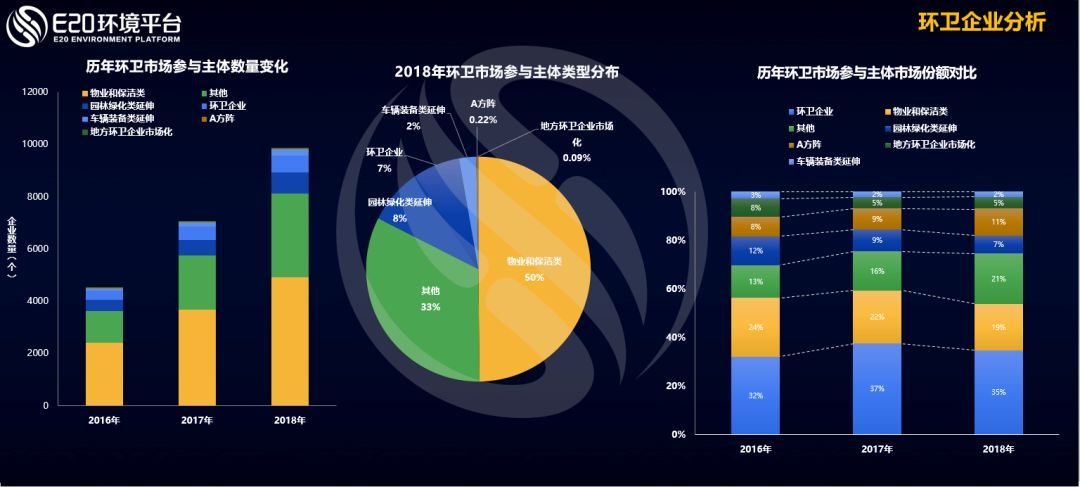 從環(huán)衛(wèi)市場參與主體來看,根據(jù)E20環(huán)境平臺(tái)E標(biāo)通統(tǒng)計(jì)顯示,近三年來,參與環(huán)衛(wèi)市場化項(xiàng)目爭奪的環(huán)衛(wèi)企業(yè)從五千家漲到了一萬家,參與主體大幅擴(kuò)增導(dǎo)致行業(yè)集中度未出現(xiàn)增長。(相關(guān)鏈接→ 5000+企業(yè)進(jìn)軍環(huán)衛(wèi)市場 環(huán)衛(wèi)一體化讓企業(yè)“腦洞”大開)E20研究院數(shù)據(jù)中心對(duì)環(huán)衛(wèi)企業(yè)進(jìn)行了企業(yè)原有業(yè)務(wù)來源分析可以看出,從事物業(yè)保潔、園林綠化等多種企業(yè)紛紛布局環(huán)衛(wèi)業(yè)務(wù)。在上圖右側(cè)特別值得注意的是:來自垃圾焚燒A方陣的部分投資運(yùn)營企業(yè)已進(jìn)入環(huán)衛(wèi),在前年8%的市場規(guī)模占比,在今年已經(jīng)上漲到11%,在進(jìn)入企業(yè)大擴(kuò)容的基礎(chǔ)上其份額反而逆勢穩(wěn)健提高,說明我們這些垃圾焚燒影響力企業(yè)的市場沖擊力何等之大。