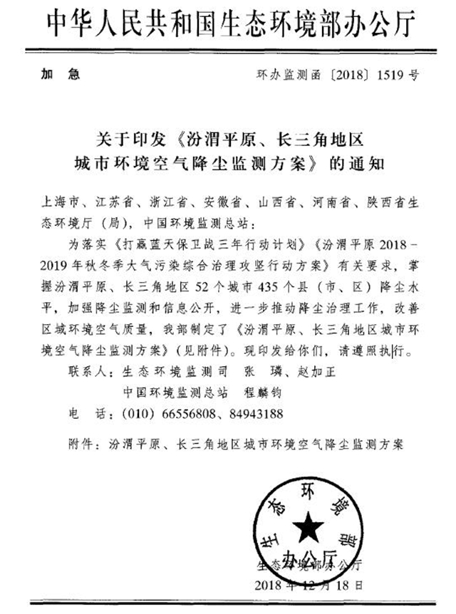 環(huán)境部印發(fā)《汾渭平原、長(zhǎng)三角地區(qū)城市環(huán)境空氣降塵監(jiān)測(cè)方案》。