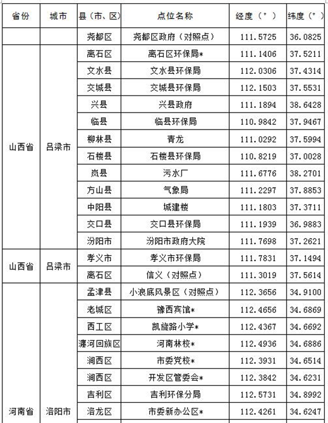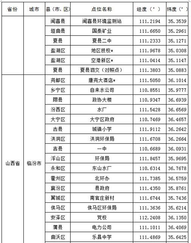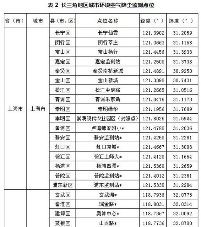 汾渭平原11個(gè)地級(jí)市共設(shè)置147個(gè)監(jiān)測(cè)點(diǎn)位,參見(jiàn)表1,其中國(guó)控站點(diǎn)共38個(gè);長(zhǎng)三角地區(qū)41個(gè)地級(jí)市共設(shè)置404個(gè)點(diǎn)位,其中國(guó)控站點(diǎn)共122個(gè),參見(jiàn)表2。表格中點(diǎn)位名稱后打“*”表示國(guó)控站點(diǎn)。