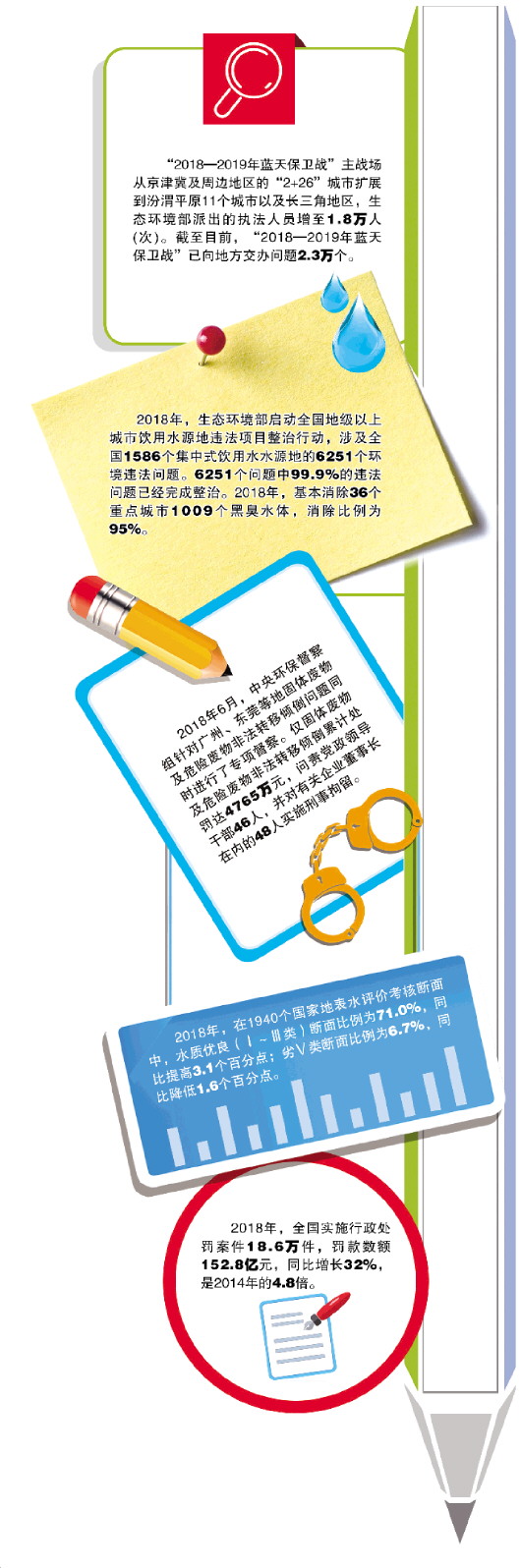 生態(tài)環(huán)境部公開的數(shù)據(jù)便是有力的證明——2018年,全國338個(gè)地級及以上城市優(yōu)良天數(shù)比例同比提高1.3個(gè)百分點(diǎn),細(xì)顆粒物(PM2.5)濃度同比下降9.3%;其中,北京市PM2.5濃度同比下降12.1%。2018年,在1940個(gè)國家地表水評價(jià)考核斷面中,水質(zhì)優(yōu)良(Ⅰ~Ⅲ類)斷面比例為71.0%,同比提高3.1個(gè)百分點(diǎn);劣Ⅴ類斷面比例為6.7%,同比降低1.6個(gè)百分點(diǎn)。