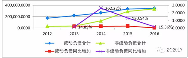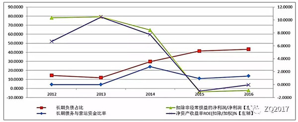 由于公司內(nèi)部的資金流動水平不高,2014年,2015年籌資力度加大,期間利用短期融資券和定向工具多次募資。同期長期負(fù)債也明顯增加,長期債務(wù)占比接近約40%,2015年籌資資金流凈額同比增加323.73%,賬面余額已經(jīng)接近40億元。