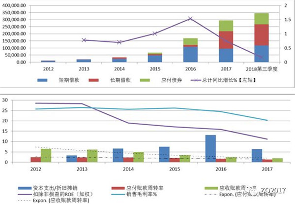 截至2018年第三季度,公司在建工程賬面余額約406,115萬元,是同期固定資產(chǎn)賬面價值的53倍,主要通過PPP業(yè)務(wù)模式開展。隨著業(yè)務(wù)擴(kuò)張,近幾年公司的資本支出水平明顯, 2016年的資本支出/折舊攤銷高達(dá)13,同期的負(fù)債水平也明顯上升。2017年公司加大長期借款額度,長期負(fù)債占比上升至32,同比增加約50%。但企業(yè)的營運(yùn)資金效率水平欠缺,自2016年,長期債務(wù)/營運(yùn)資金比例明顯增加,2017年比值接近202,償債壓力顯現(xiàn)。而2015-2017年企業(yè)的經(jīng)營現(xiàn)金流凈額呈現(xiàn)負(fù)值,盈利空間下滑,而2016、2017的應(yīng)收賬款占比在50%以上,且回款率有所降低,壞賬風(fēng)險增加?;诖耍疚磥淼漠a(chǎn)能釋放和成本控制將對公司可持續(xù)經(jīng)營起到關(guān)鍵作用。2017年年報顯示公司的多個項(xiàng)目已經(jīng)完工轉(zhuǎn)入固定資產(chǎn),2018-2019年將開始投產(chǎn)。某種程度上和公司的組織調(diào)整相呼應(yīng)。