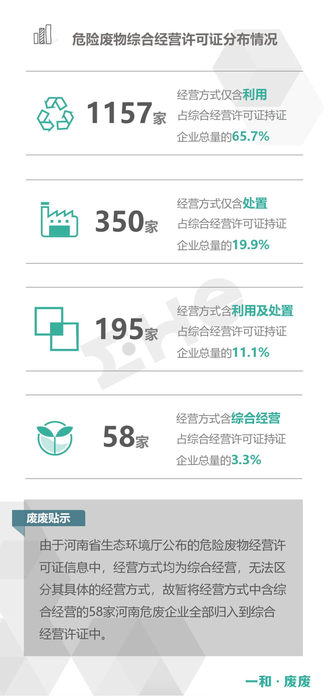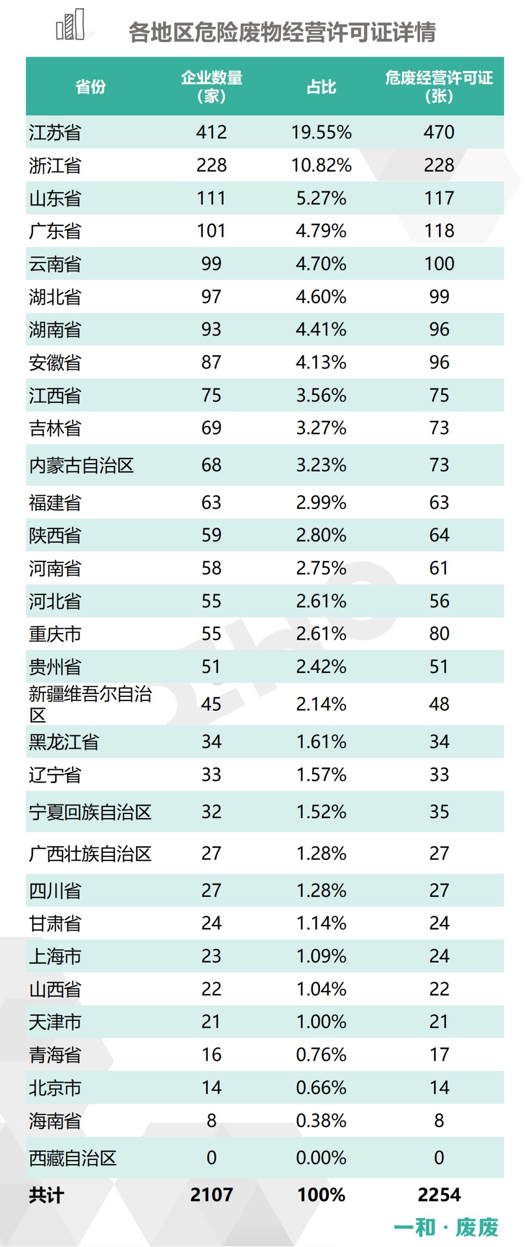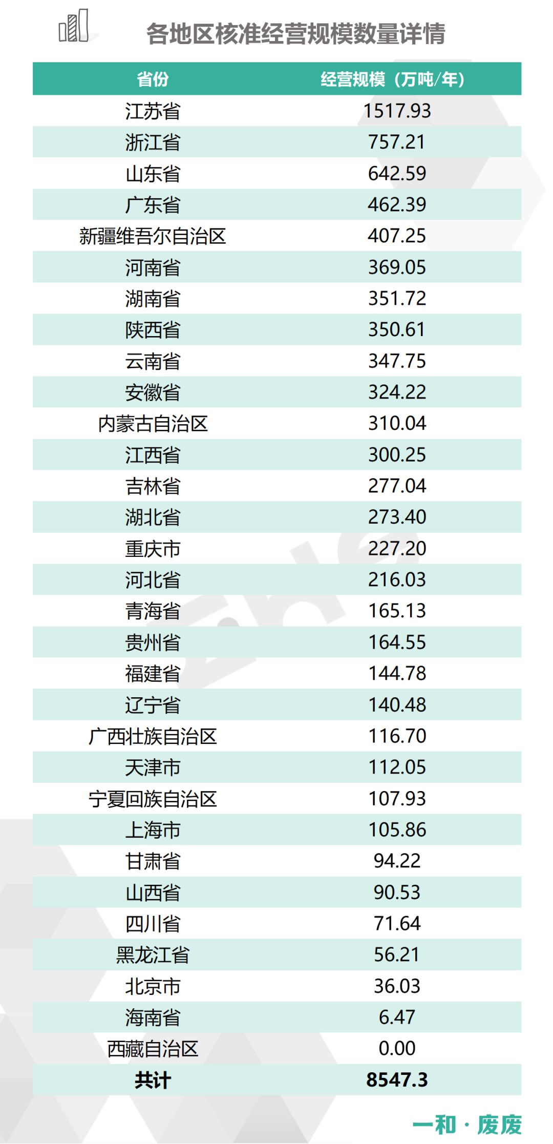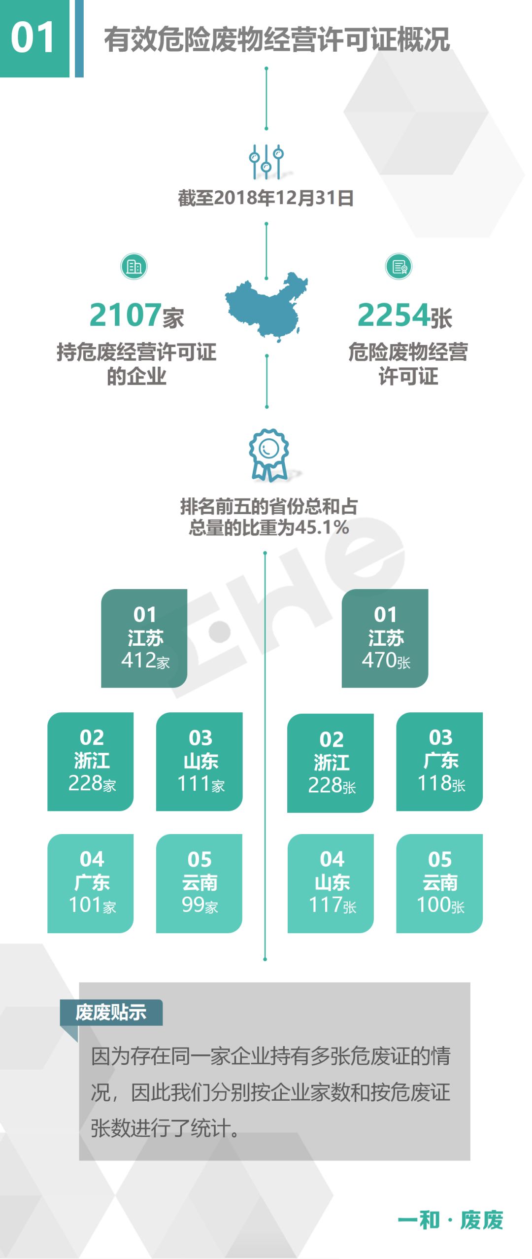2、統(tǒng)計范圍:本次數(shù)據(jù)收集統(tǒng)計的范圍為省級生態(tài)環(huán)境廳(局)官方公布的持有危險廢物經(jīng)營許可證企業(yè)的數(shù)據(jù),因此由地級市發(fā)布的醫(yī)療廢物經(jīng)營許可證、收集經(jīng)營許可證,且未納入省級生態(tài)環(huán)境廳(局)公布數(shù)據(jù)的部分,并未計入統(tǒng)計數(shù)據(jù)中。