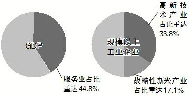服務(wù)業(yè)占GDP比重達(dá)45.8%,高新技術(shù)產(chǎn)業(yè)、戰(zhàn)略性新興產(chǎn)業(yè)增加值占規(guī)上工業(yè)比重分別達(dá)35%、18.5%左右;單位GDP能耗下降1%,單位二氧化碳排放量下降2.5%,萬(wàn)元GDP用水量下降5.3%。
