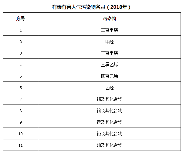 2019年1月23日,生態(tài)環(huán)境部與衛(wèi)生健康為聯(lián)合制定發(fā)布了《有毒有害大氣污染物名錄(2018年)》,污染物包括二氯甲烷、甲醛、三氯甲烷、三氯乙烯等。
