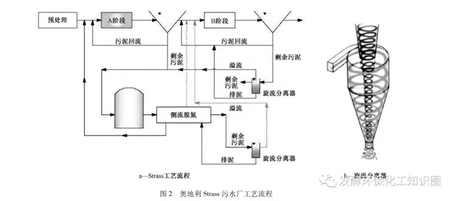 斯特拉斯污水處理廠以主流傳統(tǒng)工藝( AB法)與側(cè)流新型脫氮工藝( 厭氧氨氧化) 相結(jié)合的方式,運(yùn)行工藝如圖2a所示。可知: 污水經(jīng)過預(yù)處理進(jìn)入A段吸附( adsorption) 去除有機(jī)物,可有效防止過高的有機(jī)物對(duì)厭氧氨氧化菌的抑制。之后污水進(jìn)入B段生物降解過程( biodegradation) ,即采用一體式厭氧氨氧化工藝脫氮。在A段吸附了大量有機(jī)物的污泥,經(jīng)過排泥、剩余污泥濃縮、厭氧消化和脫水等過程后,產(chǎn)生的污泥厭氧消化液和污泥脫水液氨氮濃度較高,采用側(cè)流厭氧氨氧化DEMON工藝脫氮。側(cè)流部分通過旋流分離器( 圖2b) 分離絮體( 主要是AOB)和顆粒污泥( 主要AnAOB) ,從而富集厭氧氨氧化菌。在主流工藝中,除了傳統(tǒng)方式的污泥回流外,還需要回流測(cè)流工藝的污泥實(shí)現(xiàn)對(duì)AOB和AnAOB生物強(qiáng)化。除此之外,該工藝還將部分污泥消化液定期回流至B階段,進(jìn)行氨氮負(fù)荷的調(diào)控。