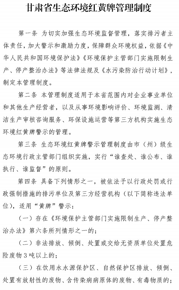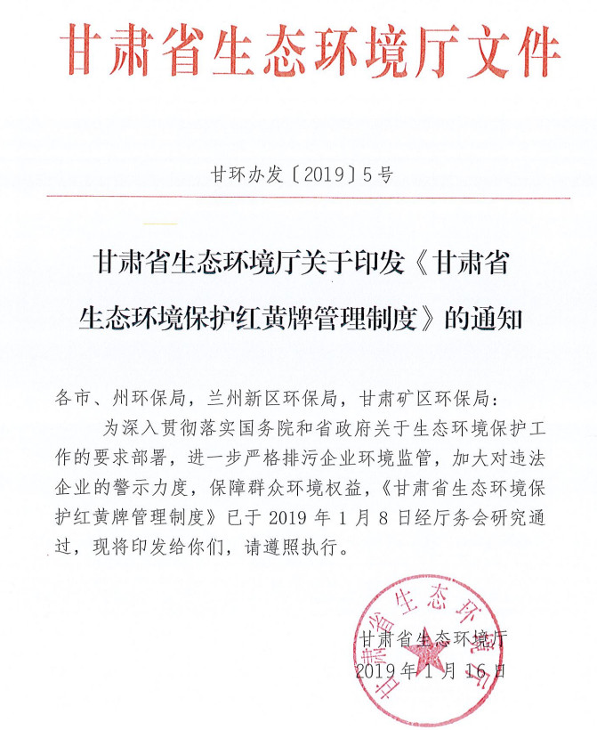 近日,甘肅省生態(tài)環(huán)境廳發(fā)布了甘肅省生態(tài)保護(hù)紅黃牌管理制度的通知,重點(diǎn)大氣污染物或水污染物,超過(guò)總量控制指標(biāo)50%以上的將受黃牌警示,第三方環(huán)境監(jiān)測(cè)數(shù)據(jù)造假將受紅牌警示,全文如下: