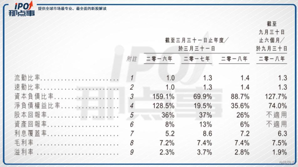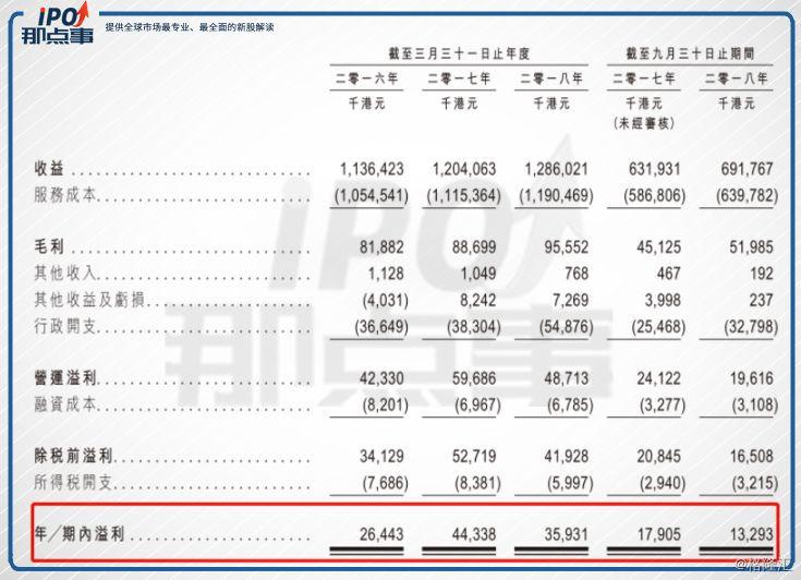 根據(jù)招股書數(shù)據(jù),公司的近3年度及2018年中期的收入分別約為11.364億港元、12.041億港元、12.86億港元及6.918億港元。于相應(yīng)年度╱期間,毛利分別約為8190萬港元、8870萬港元、9560萬港元及5200萬港元。