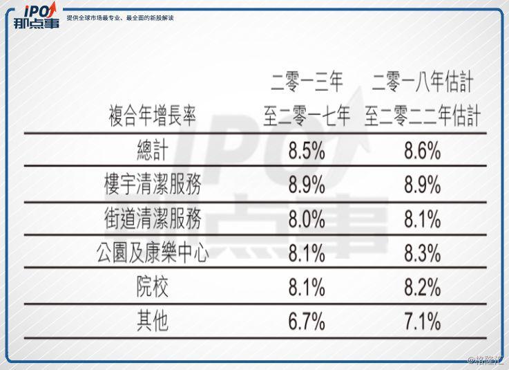 根據(jù)招股書資料,香港的環(huán)衛(wèi)服務(wù)市場(chǎng)從2013年的103.84億港元增長至2017年的143.84億港元,復(fù)合年增長率8.5%,未來預(yù)測(cè)也將按復(fù)合年增長率8.6%增長,樓宇清潔服務(wù)占香港環(huán)境衛(wèi)生服務(wù)市場(chǎng)最大份額,但復(fù)合年增長率也只有8.9%,其他同類業(yè)務(wù)也大概在此區(qū)間。