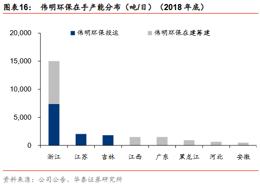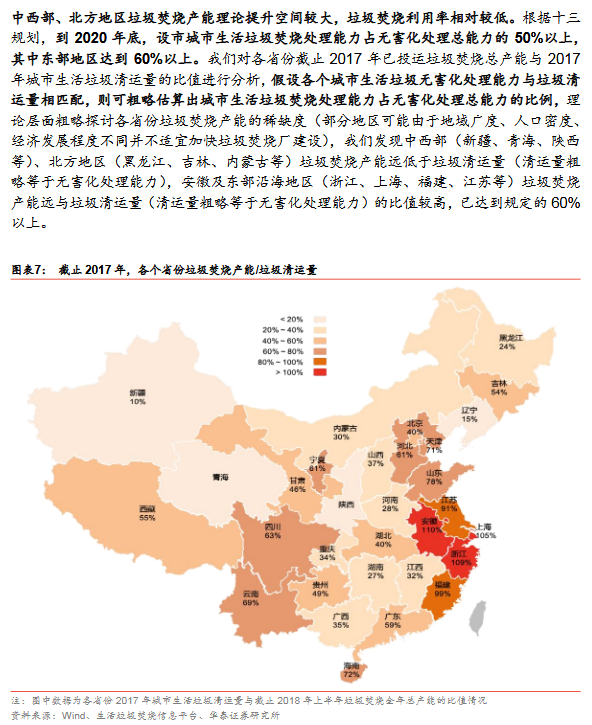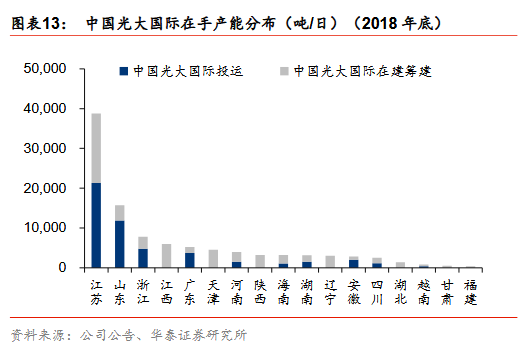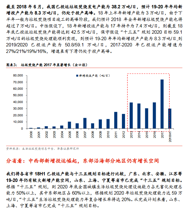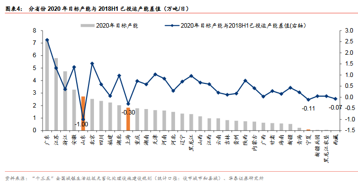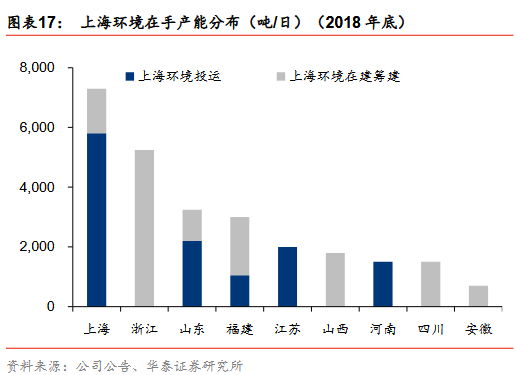 產(chǎn)能加速釋放:17年城市新增4.2萬噸/日(2012-2016年均新增3.2萬噸/日);17縣城投運速度提速,我們估計17新增3.2萬噸/日(十二五年均新增0.4萬噸/日)。按照選取典型上市公司(18年已投運產(chǎn)能市占率29%)投產(chǎn)規(guī)劃,18-20年累計投運增速24%/24%/33% vs 按照十三五規(guī)劃測算18-20年累計投運產(chǎn)能增速23%/19%/16%,上市公司投產(chǎn)增速高于行業(yè)增速,表明1)行業(yè)增速可能超預期或 ;2)上市公司已投運市占率將提升。分區(qū)域:山東/上海/寧夏等省市提前完成十三五目標,廣東/北京/安徽/江蘇等19-20年仍具較大空間,中西部新增投運崛起,東部部分地區(qū)仍有空間。