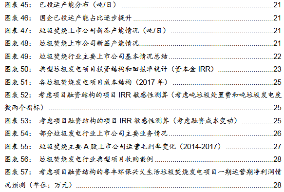 情景:考慮項目融資結(jié)構(gòu)的資本金IRR測算:我們假設(shè)項目的資本結(jié)構(gòu)為70%債務,30%自有資金,參考中國天楹/綠色動力的公司財務狀況,假設(shè)其項目的債務資金的綜合成本分別為6.5%/5.6%,各個項目每年將新增部分財務費用,我們計算得到各個項目慮融資杠桿后的IRR,其中最高的為綠色動力海寧項目IRR為30.0%,主因為其噸垃圾發(fā)電量和噸投資額均為所列示可比項目最低。中國天楹延吉項目和康恒廣水項目IRR相對較低分別為17.1%/20.3%,主因其垃圾處置費明顯較低,且中國天楹延吉項目噸垃圾發(fā)電量顯著低于其他項目。根據(jù)我們的敏感性分析,假設(shè)垃圾處置費增加5元/噸,各個垃圾發(fā)電項目IRR增加0.6 pct -0.9pct;噸垃圾發(fā)電+20千瓦時/噸,各個項目的IRR增加.5pct ~2.3 pct。