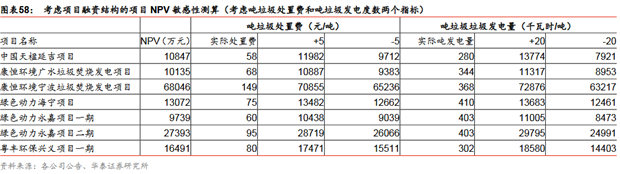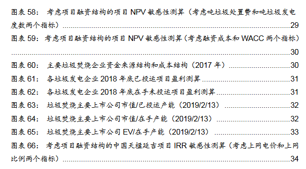典型項目的NPV考慮項目融資結(jié)構(gòu)的項目NPV測算:我們假設(shè)項目的資本結(jié)構(gòu)為70%債務,30%自有資金,參考中國天楹/綠色動力的公司財務狀況,假設(shè)其項目的債務資金的綜合成本分別為6.5%/5.6%,各個項目每年將新增部分財務費用。依據(jù)之前的投資數(shù)據(jù)和現(xiàn)金流數(shù)據(jù),我們計算得到各個項目考慮融資杠桿后的NPV,其中最高的為康恒寧波項目,其NPV為6.8億元,主要是因為其噸垃圾處置費高于其他所有項目,并且噸垃圾發(fā)電量也處于相對較高水平;而天楹延吉項目、康恒廣水項目、綠色動力海寧、綠色動力永嘉項目一期的NPV均較低,分別為1.08億元、1.01億元、1.31億元、0.97億元,主要因為前兩個項目的噸垃圾處置費和噸垃圾發(fā)電量均較低,而后兩個項目的噸垃圾處置費較低。我們再次計算了各項目的單位產(chǎn)能NPV,發(fā)現(xiàn)天楹延吉項目、康恒廣水項目、綠色動力永嘉項目一期的該指標分別僅有13.56萬元/噸、16.89萬元/噸、19.48萬元/噸,而康恒寧波項目、綠色動力永嘉項目二期、綠色動力海寧項目則分別達到30.24萬元/噸、28.83萬元/噸、26.14萬元/噸,再一次反映了后三個項目相對更高的噸垃圾處置費和噸垃圾發(fā)電量所帶來的更高的項目價值。根據(jù)我們的敏感性分析,假設(shè)垃圾處置費增加5元/噸,各個垃圾發(fā)電項目的NPV增加410-2809萬元;噸垃圾發(fā)電增加20千瓦時/噸,各個項目的NPV增加區(qū)間為611-4830萬元。我們考慮融資成本和WACC兩個指標再次對各個項目的NPV進行敏感性分析,發(fā)現(xiàn)融資成本增加0.3pct時, 各個項目的NPV降低322萬元-2120萬元;WACC增加0.5pct時,各個項目的NPV降低789萬元-5033萬元。