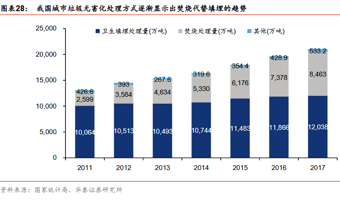 驅(qū)動因素二:土地有限,鄰避效應減弱驅(qū)使填埋轉(zhuǎn)焚燒在我國,垃圾焚燒相比于填埋方式優(yōu)勢顯著,更受政策鼓勵。我國主要垃圾處理方式有衛(wèi)生填埋、焚燒發(fā)電和堆肥等三種方式。衛(wèi)生填埋是目前我國城市垃圾處理的主導方式,但存在二次污染隱患;堆肥方式在我國已逐漸退出,具有項目建設(shè)成本高、效益低、存在重金屬污染等問題,處理規(guī)模受到限制;相比之下,垃圾焚燒方式不僅污染控制標準已與國際標準(GB標準)接軌,經(jīng)濟效益也遠優(yōu)于衛(wèi)生填埋,具有盈利模式清晰,市場化程度高,可持續(xù)等優(yōu)勢,因此具有較大發(fā)展空間。根據(jù)國家統(tǒng)計局統(tǒng)計數(shù)據(jù),“十二五”期間我國垃圾焚燒處理能力增長了149.7%?!笆濉蹦├贌幚砹空祭鵁o害化處理量34%,復合增速為22%,衛(wèi)生填埋處理量垃圾無害化處理64%,復合增速為4%,“十二五”期間垃圾焚燒處理量增速顯著高于衛(wèi)生填埋處理量增速。