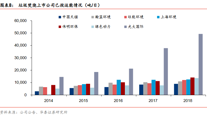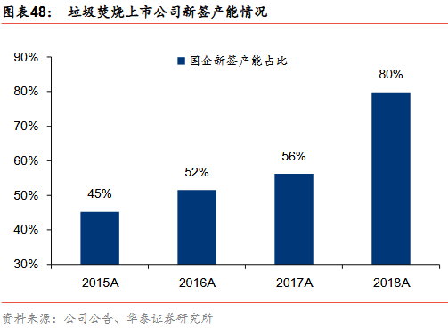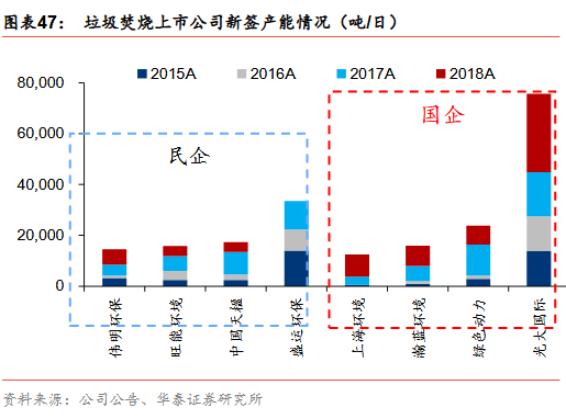 新增訂單趨勢:國企拿單能力強于民企。我們對光大國際、綠色動力、瀚藍環(huán)境、上海環(huán)境、盛運環(huán)保、中國天楹、旺能環(huán)境、偉明環(huán)保幾家典型垃圾發(fā)電上市公司2015-2018年新簽訂單進行分析,其中光大國際、綠色動力、瀚藍環(huán)境、上海環(huán)境四家國企2015年新簽訂單1.8萬噸/日,占8家上市公司新簽訂單總產(chǎn)能的45%,2016年提升至52%、2017年繼續(xù)提升至56%,2018年四家國企新簽訂單總產(chǎn)能為5.5萬噸/日,占比提升至80%,國企拿單能力顯著強于民企。