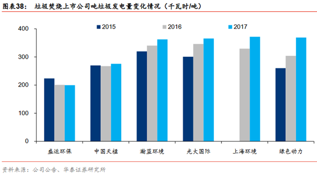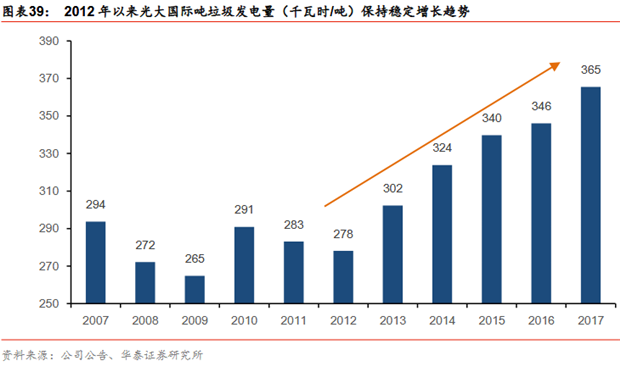 垃圾分類+技術(shù)的進步=噸垃圾發(fā)電量提升,上市公司層面可以觀察到幾家典型垃圾發(fā)電企業(yè)在2015-2017年噸垃圾發(fā)電量顯著提升,其中綠色動力、光大國際分別由16年的260千瓦時/噸、301千瓦時/噸提升至17年的369千瓦時/噸、365千瓦時/噸。長周期來看,光大國際噸垃圾發(fā)電量由2012年的278千瓦時/噸提升至2017年的365千瓦時/噸,提升幅度明顯。