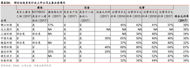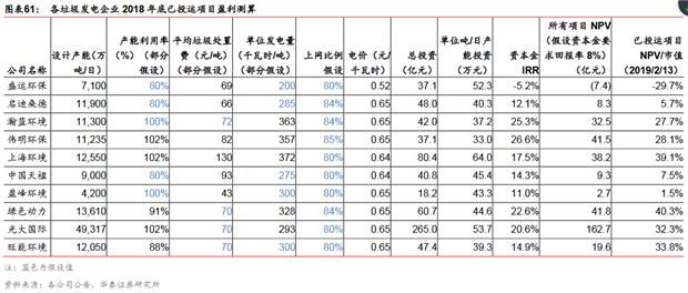項目達產(chǎn)后主要收入來自發(fā)電收入,主要成本來自折舊、原材料和人工:首先假設(shè)該項目資金100%來自自有資金投資的情況下,則項目主要的收入、成本情況如下:1)收入:垃圾處置收入+發(fā)電收入。項目達產(chǎn)后,滿產(chǎn)狀態(tài)下可得出項目的年垃圾處理量,按照各個項目的垃圾處置費(所列項目中最高為康恒寧波項目的149元/噸,最低為中國天楹延吉項目的58元/噸),則項目除增值稅后可測得年垃圾處置收入;按照0.65元/度的發(fā)電收入(部分項目比如康恒寧波項目、綠色動力永嘉、綠色動力海寧項目為0.66元/度),結(jié)合各項目噸垃圾發(fā)電量(所列項目中最高為綠色動力海寧項目的410度/噸,最低為中國天楹延吉項目的280度/噸),結(jié)合個項目的上網(wǎng)比例(79%-85%之間),可測得扣除增值稅后年垃圾發(fā)電收入;可以看出,噸垃圾處置費和噸垃圾發(fā)電量是決定收入端的主要變量。2)成本:以中國天楹延吉項目為例,根據(jù)其非公開發(fā)行報告書披露,成本構(gòu)成中折舊占比47%(天楹按照資產(chǎn)預計使用壽命與該BOT項目特許經(jīng)營權(quán)協(xié)議規(guī)定的經(jīng)營期孰低確定,基本上折舊年限在20年)、原材料占比20%、工資及福利占比15%、維護費用(考慮大修、年修及日常維護費用)占比11%、污水及爐渣處置占比7%。總體來看,成本端中折舊攤銷、原材料和人工占比在80%左右。