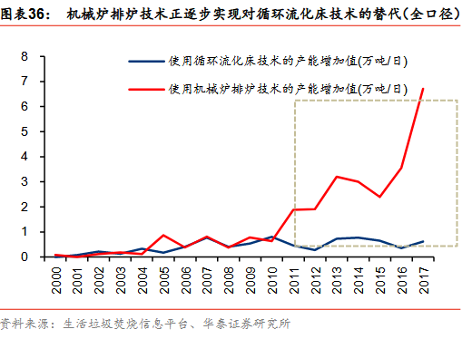 國際上機械爐排爐技術(shù)已經(jīng)非常成熟并且被廣泛使用,相比循環(huán)流化床技術(shù),機械爐排爐技術(shù)擁有單臺焚燒爐的垃圾處理量大、進料垃圾不需要進行預處理、對垃圾的成分要求低、污染物排放和灰渣熱灼減率等指標更易達標、燃燒狀態(tài)穩(wěn)定、運行成本低、年運行時間長、操作簡便等優(yōu)勢。而國內(nèi)2012年發(fā)布的《國家發(fā)展改革委關(guān)于完善垃圾焚燒發(fā)電價格政策的通知》和2014年發(fā)布的《生活垃圾焚燒污染控制標準》等政策也使得循環(huán)流化床技術(shù)的運行成本增加,因而近年來機械爐排爐技術(shù)正在逐步實現(xiàn)對循環(huán)流化床技術(shù)的替代。
