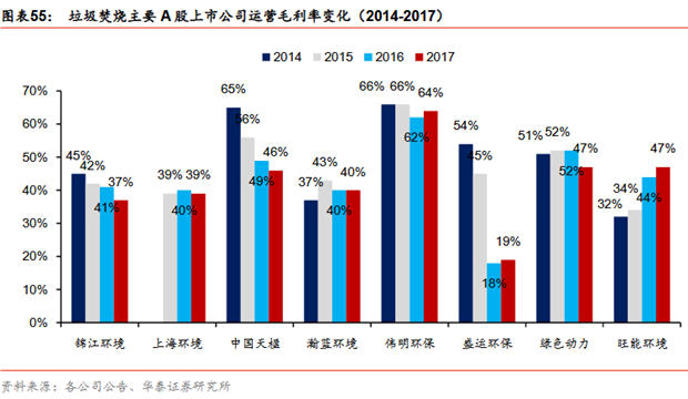 上市公司會計政策差異:垃圾焚燒會計處理方法各不相同。下面我們選取了行業(yè)里一些主要的上市公司分析,匯總?cè)缦卤?,其中:BOT計入工程收入的主要有錦江環(huán)境、光大國際、上海環(huán)境、瀚藍環(huán)境、盛運環(huán)保、綠色動力;BOT計入設(shè)備銷售收入的主要有:光大國際、中國天楹、偉明環(huán)保、盛運環(huán)保,其中偉明環(huán)保的設(shè)備銷售的毛利率較高,大約在46%左右;各公司的運營毛利率有一定差異,大部分公司2016年毛利率出現(xiàn)了同比下滑,預計由于新投運項目的盈利能力不如老項目所致。其中偉明環(huán)保垃圾發(fā)電項目毛利率高出行業(yè)平均較多,主要是因為設(shè)備折舊費用少,設(shè)備折舊費用可以占到垃圾焚燒成本的40%-50%,而偉明環(huán)保的設(shè)備折舊較少主要有兩點原因:1)偉明環(huán)保自產(chǎn)爐排爐設(shè)備,同時不計設(shè)備銷售收入,因此在在建工程確認時并不包含設(shè)備毛利(一般設(shè)備毛利率約40%),因此最終轉(zhuǎn)入無形資產(chǎn)特許經(jīng)營權(quán)的金額比其他公司大約節(jié)省了40%的設(shè)備投資;2)偉明環(huán)保采取的折舊方法是按照特許經(jīng)營權(quán)年限折舊,按照2016年特許經(jīng)營權(quán)折舊的數(shù)據(jù)估計,綜合折舊年限在25年,折舊年限長于啟迪桑德、瀚藍環(huán)境、中國天楹、光大國際(這些公司采取特許經(jīng)營權(quán)和資產(chǎn)使用年限孰短的方法折舊,一般綜合折舊年限為20年)。