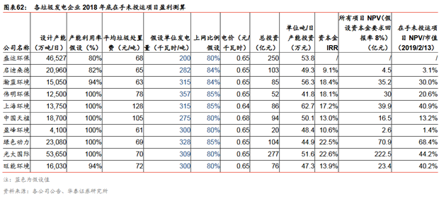 資產(chǎn)角度:項目回報率和公司NPV估值測算已投運和在手項目IRR和NPV的主要假設(shè):1)所有項目建設(shè)期2年(含有半年試運營期),運營期30年;2)項目投資額未公布,則參考已知項目的平均單位投資額,大約單位噸/日處理能力在30-50萬元;3)項目資本結(jié)構(gòu)參考公司2016年底的資產(chǎn)負債率以及有息負債情況假設(shè);4)折舊年限按照公司的會計準則描述以及攤銷費用占無形資產(chǎn)比例倒推得出;5)貸款費用參考公司2017年的綜合財務成本(利息費用/有息負債均值);6)運營期成本結(jié)構(gòu)參考中國天楹延吉項目,沒有考慮各公司運營管理能力的差異,統(tǒng)一假設(shè):原材料、工資及福利、維修和環(huán)保費用占比分別為14%/10%/10%;7)所得稅三免三減半,增值稅發(fā)電即征即退100%,垃圾處理費即征即退70%;7)NPV均假設(shè)資本金要求回報率為8%計算。