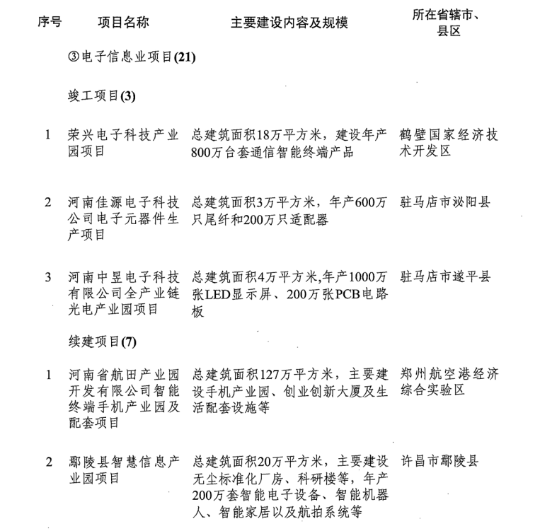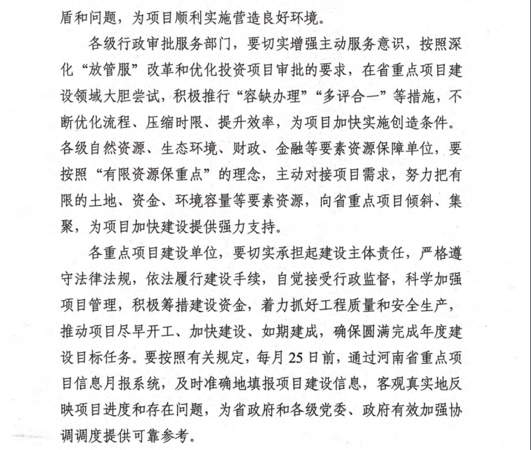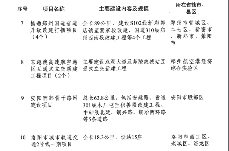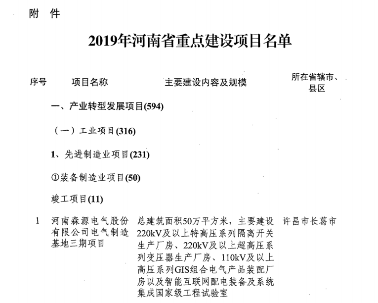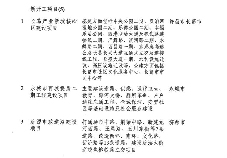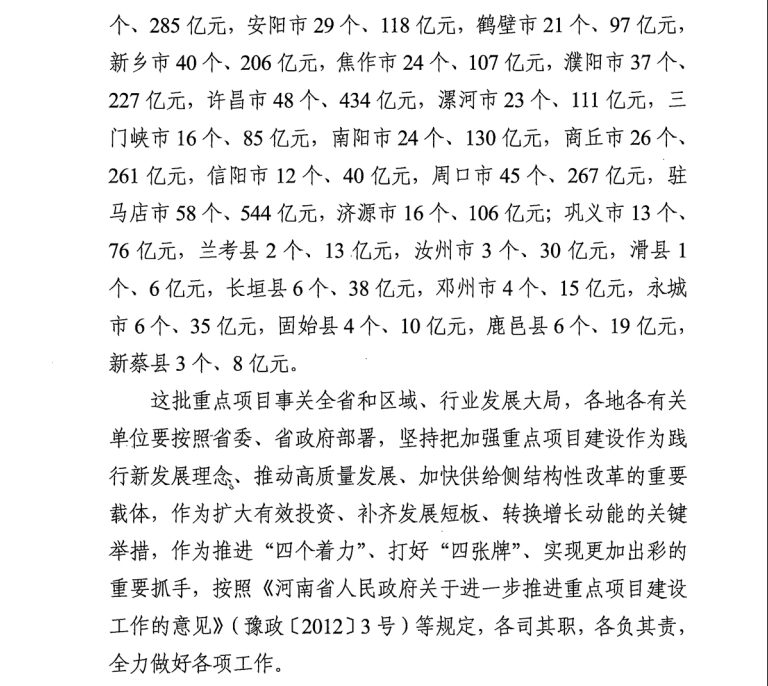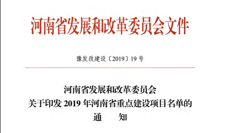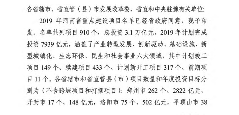 導(dǎo)讀:河南省發(fā)改委發(fā)布《關(guān)于印發(fā)2019年河南省重點(diǎn)建設(shè)項(xiàng)目名單的通知》。名單共列項(xiàng)目910個,總投資3.1萬億元,2019年計(jì)劃完成投資7939億元,涵蓋了產(chǎn)業(yè)轉(zhuǎn)型發(fā)展、創(chuàng)新驅(qū)動、基礎(chǔ)設(shè)施、新型城鎮(zhèn)化、生態(tài)環(huán)保、民生和社會事業(yè)六大領(lǐng)域18個行業(yè)。其中計(jì)劃竣工項(xiàng)目149個、續(xù)建項(xiàng)目433個、計(jì)劃新開工項(xiàng)目317個、前期項(xiàng)目11個。