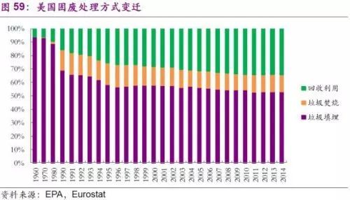 美國在經(jīng)歷了1980—2000年期間大規(guī)模的“去填埋化”后,近年來固廢處理方式較為穩(wěn)定,填埋仍是其主流處理方式,2014年占比近53%,垃圾焚燒和回收利用占比分別為13%和34%。由于垃圾焚燒有著處理成本較高,領(lǐng)避效應(yīng)等不利因素,該處理方式恐較難在美國進(jìn)一步發(fā)展?;厥绽媚壳半m因分揀環(huán)節(jié)成本較高,導(dǎo)致近年來在美國的發(fā)展速度有所放緩,但是我們認(rèn)為,隨著垃圾分類觀念的進(jìn)一步普及,和龍頭企業(yè)市場化力度的進(jìn)一步加大,美國回收利用處理占比有望進(jìn)一步提升。