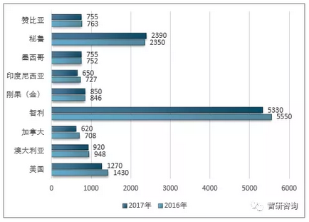 2017年全球銅礦產(chǎn)量分國家統(tǒng)計(jì)(單位:千噸)