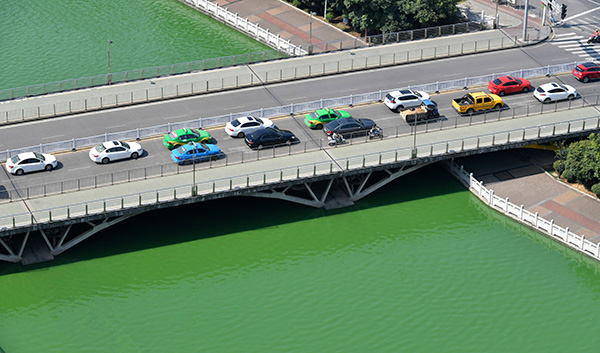 2018年9月5日,南昌市撫河故道水體發(fā)生大面積的藍(lán)藻爆發(fā),從高樓上俯瞰,整個(gè)水體墨綠一片,如同綠色油漆一般。 東方IC 資料圖
