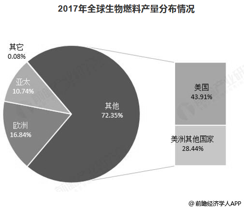 從2017年全球各區(qū)域生物燃料產(chǎn)量分布來看,主要集中在以美國為主的美洲國家,2017年達到了6085.9萬噸當(dāng)油量,全球占比達72.35%。其中美國2017年生物燃料產(chǎn)量為3693.6萬噸當(dāng)油量,占全球的43.91%,占美洲的60.69%;2017年歐洲國家生物燃料產(chǎn)量1416.7萬噸當(dāng)油量,占全球的16.84%。此外亞太地區(qū)為903.1萬噸當(dāng)油量,占比10.74%。