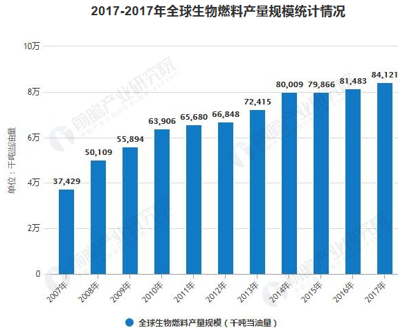 隨著全球大規(guī)模、大范圍的發(fā)展生物質(zhì)能發(fā)電,生物燃料生物燃料產(chǎn)量規(guī)模也實現(xiàn)的迅速的增長。數(shù)據(jù)顯示,2007年全球生物燃料產(chǎn)量為3742.9萬噸當(dāng)油量,至2017年上升至8412.1萬噸當(dāng)油量,2008-2017年復(fù)合增長率達8.43%。