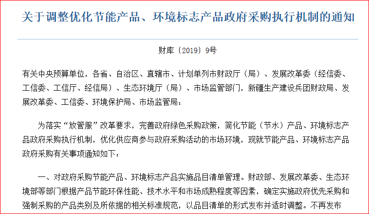 關(guān)于調(diào)整優(yōu)化節(jié)能產(chǎn)品、環(huán)境標(biāo)志產(chǎn)品政府采購執(zhí)行機(jī)制的通知