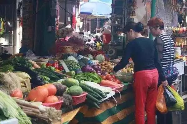 菜市場內,消費者拎著五顏六色的塑料袋在買菜。