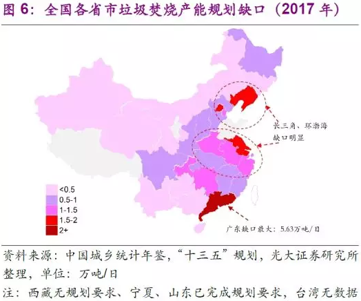 城鎮(zhèn)生活垃圾焚燒處理能力方面,根據(jù)《“十三五”全國(guó)城鎮(zhèn)生活垃圾無(wú)害化處理設(shè)施建設(shè)規(guī)劃》的要求,截止2017年,幾乎所有省市(除西藏、青海外)均存在一定的城鎮(zhèn)垃圾焚燒處理產(chǎn)能缺口。產(chǎn)廢大省之一廣東的城鎮(zhèn)垃圾焚燒產(chǎn)能缺口最大(5.63萬(wàn)噸/日),江蘇、浙江、安徽、天津、北京等長(zhǎng)三角和環(huán)渤海地區(qū)的省市在已有產(chǎn)能較多的同時(shí)也存在較大的產(chǎn)能缺口。