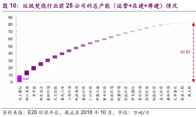 雖然目前運(yùn)營(yíng)產(chǎn)能缺口仍存,但是儲(chǔ)備產(chǎn)能較為充足。根據(jù)E20環(huán)境平臺(tái)的統(tǒng)計(jì),截止2018年10月,行業(yè)排名前25的公司的垃圾焚燒處理總產(chǎn)能(含運(yùn)營(yíng)+在建+籌建)已達(dá)82.85萬(wàn)噸/日,超規(guī)劃要求的59.14萬(wàn)噸/日。