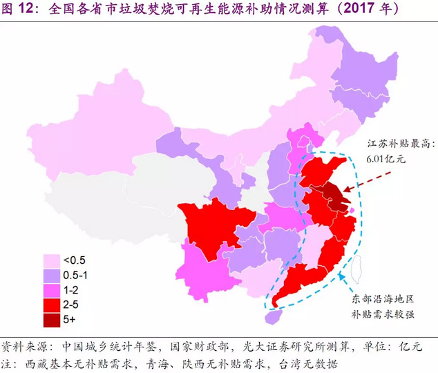 進(jìn)一步分析,垃圾焚燒產(chǎn)能充足,實(shí)際處理量較多的東部沿海地區(qū)在2017年的補(bǔ)貼需求較強(qiáng),江蘇的城鎮(zhèn)垃圾焚燒處理量居全國(guó)第一,所需補(bǔ)貼金額達(dá)6.01億元;山東、浙江、廣東、福建、安徽、四川的城鎮(zhèn)垃圾焚燒處理量位列2~7位,也是另外6個(gè)補(bǔ)貼需求超2億元的省份。