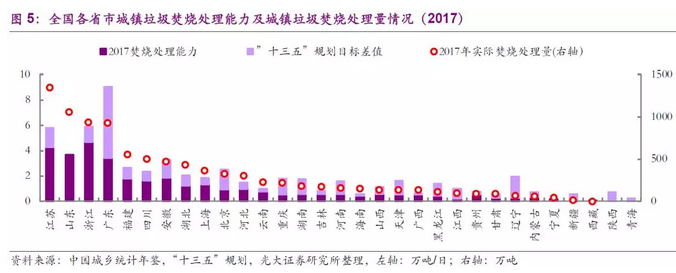 一是供需情況不同,產(chǎn)能缺口依然較大。光伏、風(fēng)電行業(yè)經(jīng)過(guò)多年的高速發(fā)展,產(chǎn)能增長(zhǎng)遠(yuǎn)超預(yù)期,同時(shí)也已基本完成國(guó)家規(guī)劃要求;而垃圾焚燒行業(yè)目前的發(fā)展尚未完成國(guó)家“十三五”規(guī)劃的目標(biāo)(2020年設(shè)市城市生活垃圾焚燒占比50%,全國(guó)城鎮(zhèn)(設(shè)市+縣城)生活垃圾焚燒產(chǎn)能59.14萬(wàn)噸/日,而2017年分別為43.84%、33.14萬(wàn)噸/日)。