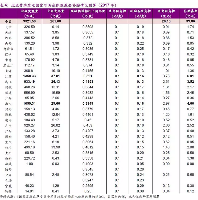 根據(jù)全國(guó)城鄉(xiāng)統(tǒng)計(jì)年鑒的數(shù)據(jù),2017年全國(guó)城鎮(zhèn)垃圾焚燒處理量達(dá)9321.50萬(wàn)噸。根據(jù)《國(guó)家發(fā)展改革委關(guān)于完善垃圾焚燒發(fā)電價(jià)格政策的通知》的補(bǔ)貼要求,每噸入廠生活垃圾折算上網(wǎng)電量假定為280度,計(jì)算得出全國(guó)垃圾焚燒上網(wǎng)發(fā)電量為261億度。進(jìn)一步根據(jù)各省市脫硫燃煤標(biāo)桿上網(wǎng)電價(jià),以及分?jǐn)傊贫纫?,假設(shè)全國(guó)所有垃圾焚燒項(xiàng)目均滿足國(guó)補(bǔ)要求并納入可再生能源基金補(bǔ)貼目錄(實(shí)際的入庫(kù)率約為51%),測(cè)算得出2017年垃圾焚燒行業(yè)需要的國(guó)家可再生能源基金補(bǔ)貼總額為39.86億元(各省電網(wǎng)負(fù)擔(dān)26.10億元),僅占2017年可再生能源基金實(shí)際支出(712.06億元)的5.60%。