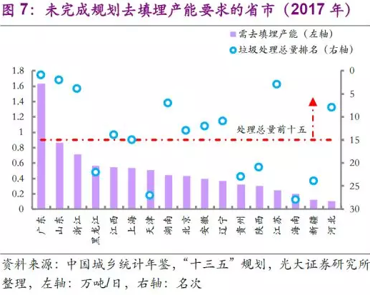 去填埋產(chǎn)能任務(wù)在產(chǎn)廢大省進(jìn)展受阻?!笆濉币?guī)劃中同時(shí)有著去填埋產(chǎn)能的要求。由于我國(guó)垃圾產(chǎn)生量持續(xù)增長(zhǎng),在焚燒產(chǎn)能仍處于爬坡期時(shí),為了完成無(wú)害化處置的要求,全國(guó)衛(wèi)生填埋處理能力從2015年的50.15萬(wàn)噸/日進(jìn)一步增長(zhǎng)至2017年的52.59萬(wàn)噸/日,距規(guī)劃要求的47.71萬(wàn)噸/日仍有不少差距。去填埋產(chǎn)能任務(wù)較重的多為產(chǎn)廢大?。◤V東、山東、浙江等),且其去填埋產(chǎn)能缺口和垃圾焚燒產(chǎn)能提升缺口呈現(xiàn)一定的相關(guān)性。