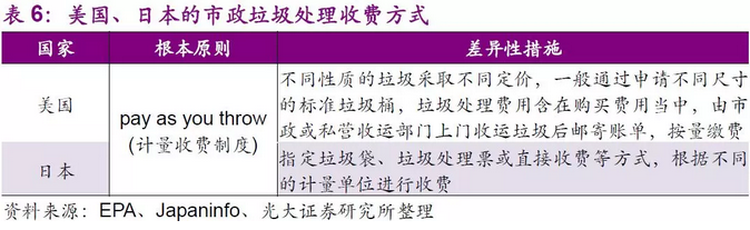 但是隨著垃圾分類和垃圾清運(yùn)市場(chǎng)化進(jìn)程的逐步完善,我們認(rèn)為未來(lái)中國(guó)有可能參照以上發(fā)達(dá)國(guó)家的收費(fèi)模式。在2017年12月20日住建部發(fā)《關(guān)于加快推進(jìn)部分重點(diǎn)城市生活垃圾分類工作的通知》(以下簡(jiǎn)稱“通知”)中,明確提出要“完善生活垃圾收費(fèi)政策,逐步建立差別化的收費(fèi)制度,實(shí)現(xiàn)按量收費(fèi)?!睆V州市作為第一個(gè)“吃螃蟹”的中國(guó)內(nèi)地城市,《廣州市生活垃圾分類管理?xiàng)l例(草案)》已提請(qǐng)市人大審議,其中首次提出了按照“多產(chǎn)生多收費(fèi)”等多項(xiàng)原則進(jìn)行收費(fèi)。2018年7月2日,發(fā)改委發(fā)布《關(guān)于創(chuàng)新和完善促進(jìn)綠色發(fā)展價(jià)格機(jī)制的意見》,提出到2020年底前,全國(guó)城市及建制鎮(zhèn)全面建立生活垃圾處理收費(fèi)制度,標(biāo)志著垃圾分類即將進(jìn)入收費(fèi)時(shí)代。