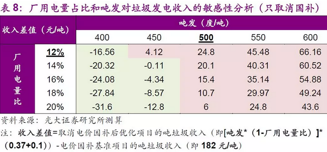 在此情景下,當(dāng)優(yōu)化項(xiàng)目的噸發(fā)達(dá)到500度/噸,或是廠用電量占比低于12%時(shí),便基本可以保證優(yōu)化項(xiàng)目的垃圾焚燒發(fā)電收入可以覆蓋基準(zhǔn)項(xiàng)目電價(jià)補(bǔ)貼帶來(lái)的額外收入,優(yōu)化項(xiàng)目在無(wú)國(guó)補(bǔ)情況下仍然可以給公司帶來(lái)穩(wěn)定收益。