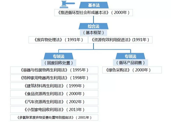 日本自2000年開始,推行《推進循環(huán)型社會基本法》,提出了建立循環(huán)型社會的目標。針對廢棄物處理提出了減量控制(reduce)、回收利用(reuse)和循環(huán)再利用(recycle)的“ 3R”原則。先后頒布實施了多部法律,包括《推進循環(huán)型社會形成基本法》,以及《廢棄物管理和公共清潔法》、《促進資源有效利用法》、《容器和包裝物回收利用法》、《家用電器回收再利用法》、《食品回收再利用法》、《建筑及材料回收法》等專項法規(guī)。