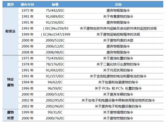歐盟通過廢棄物框架指令確立了固廢處理的理念,建立了固廢處理體系,其相關的環(huán)境法律政策實際由兩部分組成,一部分是各類指令,從法律上直接對各成員國起約束作用,另一部分是定期頒布的環(huán)境行動規(guī)劃,對各成員國進行目標、內(nèi)容上的指導。
