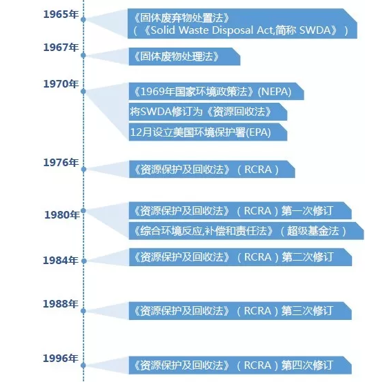 從70年代起,美國以《國家環(huán)境政策法》為基礎,成立了國家環(huán)境保護署,制定了《固體廢物處理法》、《資源保護與回收利用法》、《危險廢物管理條例》、《綜合環(huán)境反應,補償和責任法》等諸多法律,經(jīng)過多年的發(fā)展,美國環(huán)衛(wèi)行業(yè)相關法律體系已經(jīng)非常完善。其發(fā)展脈絡如下圖所示: