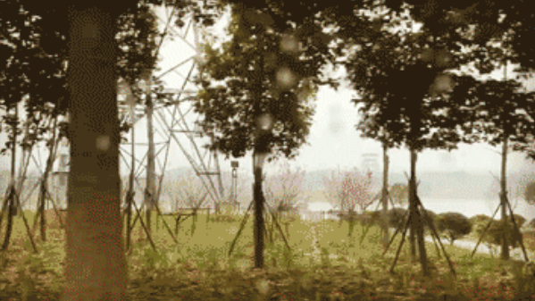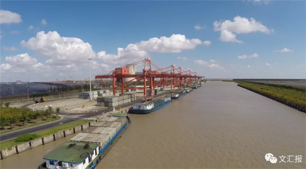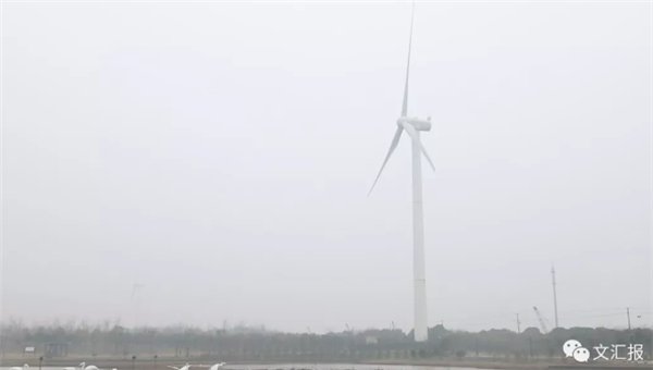細(xì)雨蒙蒙,車駛?cè)肷虾@细凵鷳B(tài)環(huán)?;亍蓚?cè)樹木成林,草坪成片。生態(tài)苑里,“烏篷聽(tīng)雨”“蘆花鷺影”景致別樣,儼然一座郊野公園。不遠(yuǎn)處,白色的風(fēng)力發(fā)電機(jī),在高空中緩緩轉(zhuǎn)動(dòng)3支葉片。不時(shí)有運(yùn)輸集卡從身邊駛過(guò)。