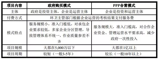 目前環(huán)境衛(wèi)生管理行業(yè)的經(jīng)營(yíng)模式主要有兩種:一是政府購(gòu)買(mǎi)服務(wù)模式,二是PPP合營(yíng)模式。