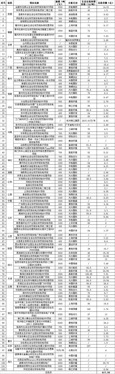 2018全年垃圾焚燒中標(簽約)項目逾100個,總投資達618億