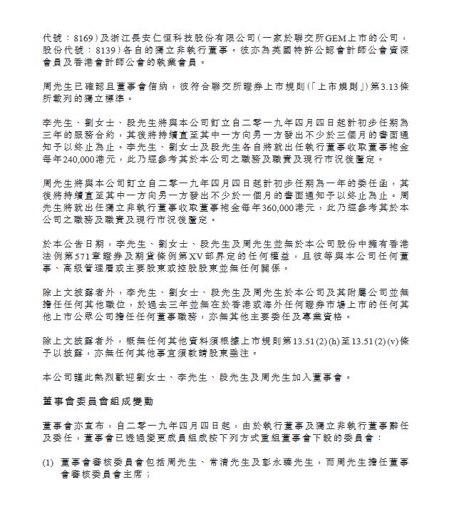 李中已獲委任為執(zhí)行董事及董事會(huì)提名委員會(huì)成員;劉玉杰已獲委任為執(zhí)行董事;段林楠已獲委任為執(zhí)行董事;周錦榮已獲委任為公司獨(dú)立非執(zhí)行董事、董事會(huì)審核委員會(huì)主席、董事會(huì)薪酬委員會(huì)成員及董事會(huì)提名委員會(huì)主席;趙雋賢及李中已獲委任為授權(quán)代表;4月4日起生效。